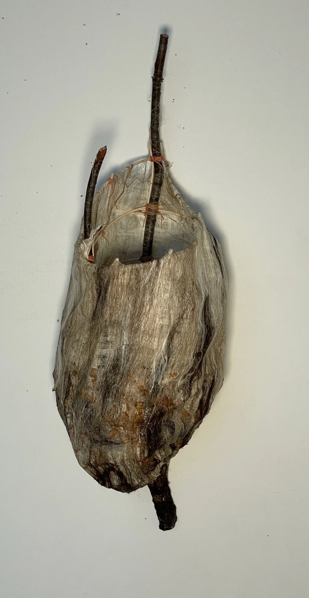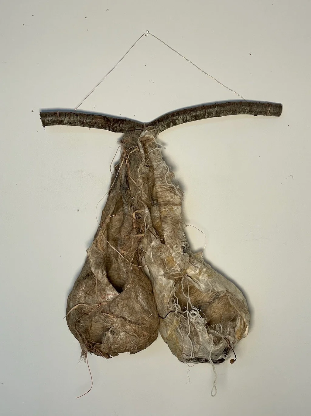 Untitled - Flax roving, handmade paper, waxed linen thread, reed, tree branch