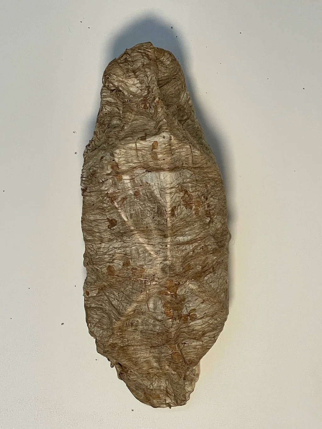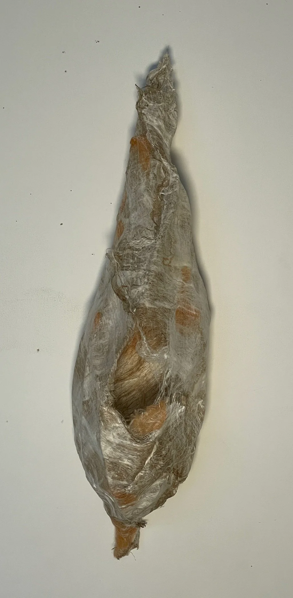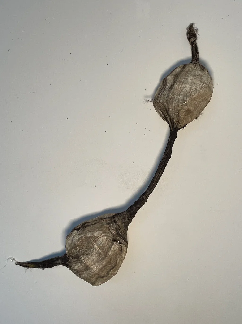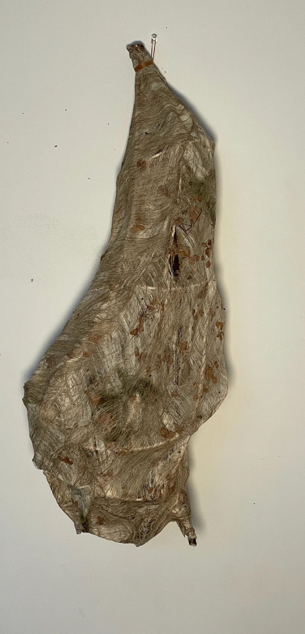 New Seed - Flax roving, hydrangea petals, reed, waxed linen thread, tree branch