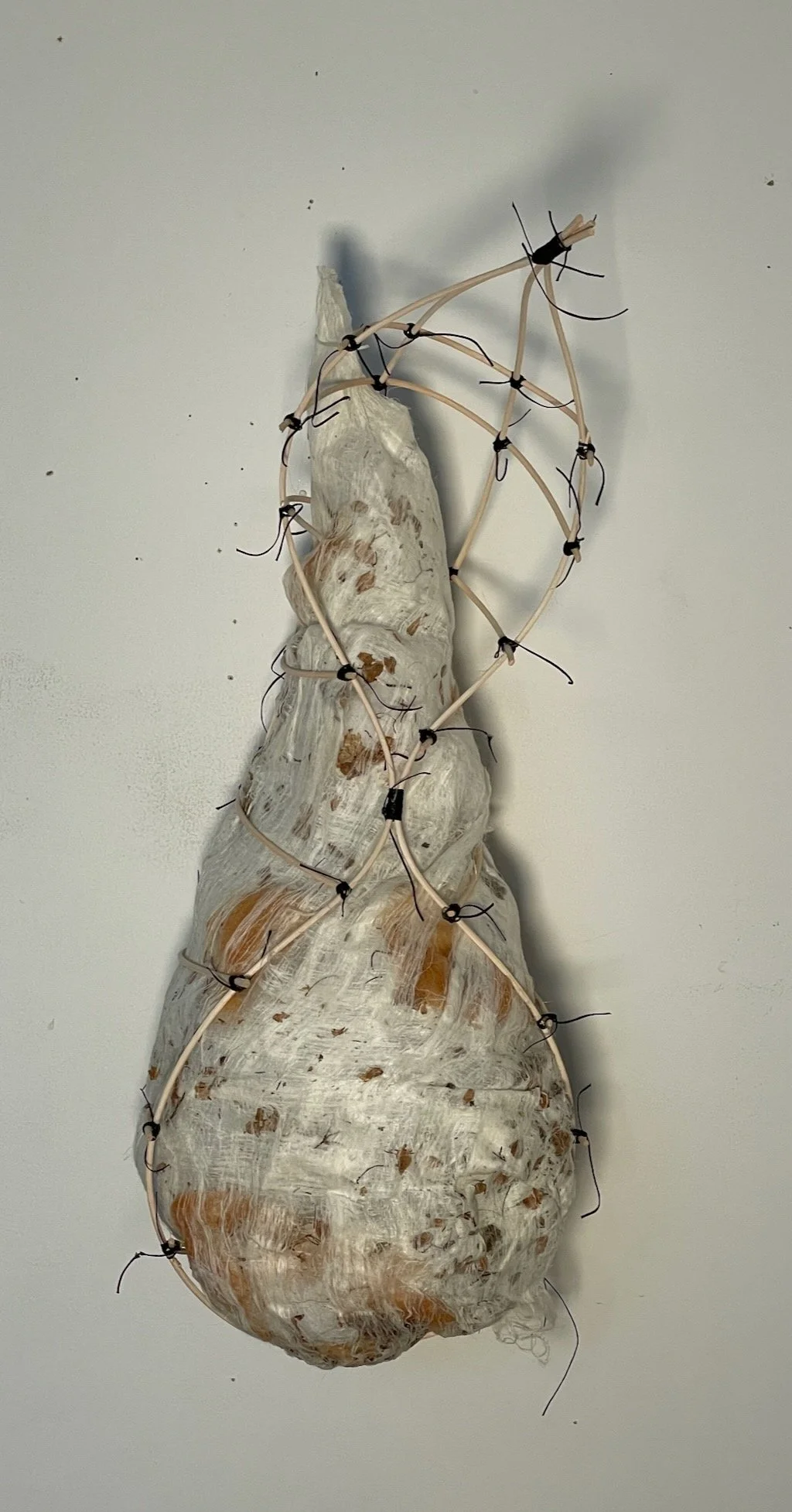 Held Tight - reed, waxed linen thread, flax roving, dyed wool, stuffing